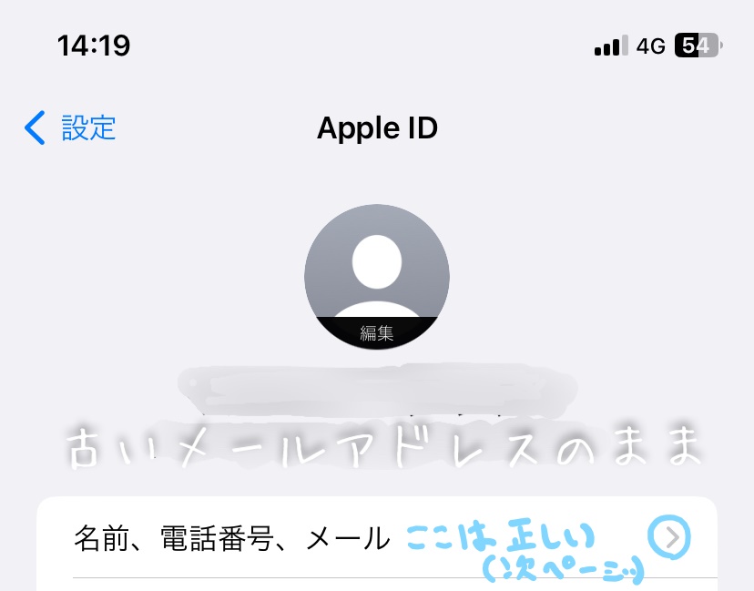 - AppleID(メールアドレス)を変更した後に「名前、電話番号、メール」の部分では新しいIDに更新されているのに、写真付きID表示の下には古いApple IDが表示されている。